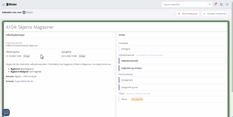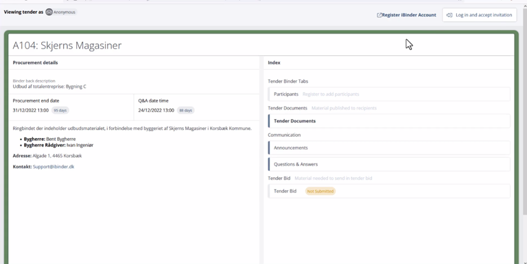 Man har som anonym samtidig mulighed for at tilgå materialet, inden man træffer en beslutning. Dette gøres ved at klikke på fanen "Udbudsmateriale".