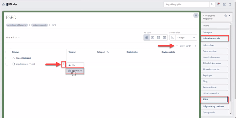 Klik på de tre små prikker ud for filnavnet og tryk "Download". Når filen er hentet ned, skal du klikke på knappen "+ Opret ESPD", for at åbne ESPD-tjenesten.