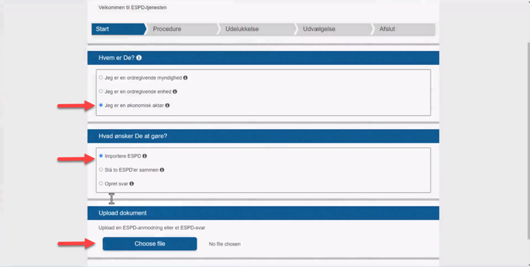 Som tilbudsgiver er du en økonomisk aktør, som ønsker at importere den ESPD-fil, som du lige har downloadet fra udbudsmaterialet: