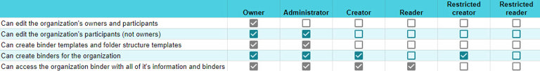 Creator(s) can create binders and access all information within the organization and all of it's binders (Participant-rights in all binders).