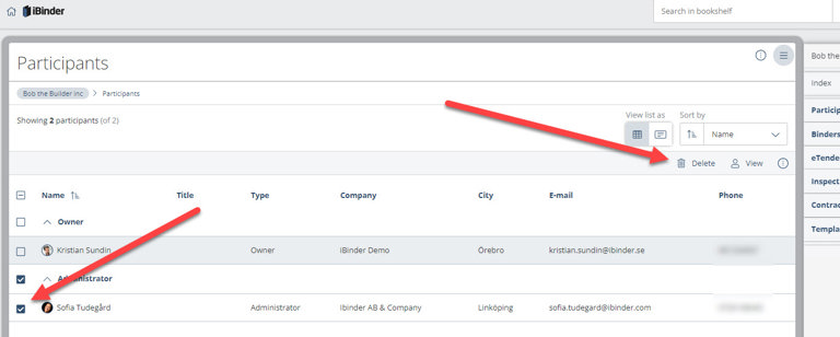 In order to remove a participant from the organization, tick the box before the person and click on "Delete". NOTE: This will only remove the participant from the organization binder, the person will NOT be removed from all of the organization's binders, if he or she has access to any of those.
