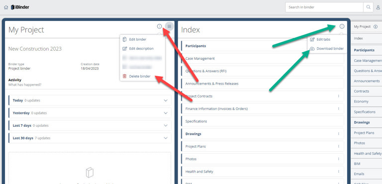 To delete a binder, open it and click according to the red arrows below and select "Delete binder". Deleting the binder will remove all content and history.