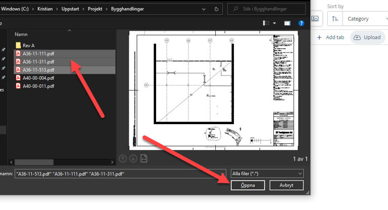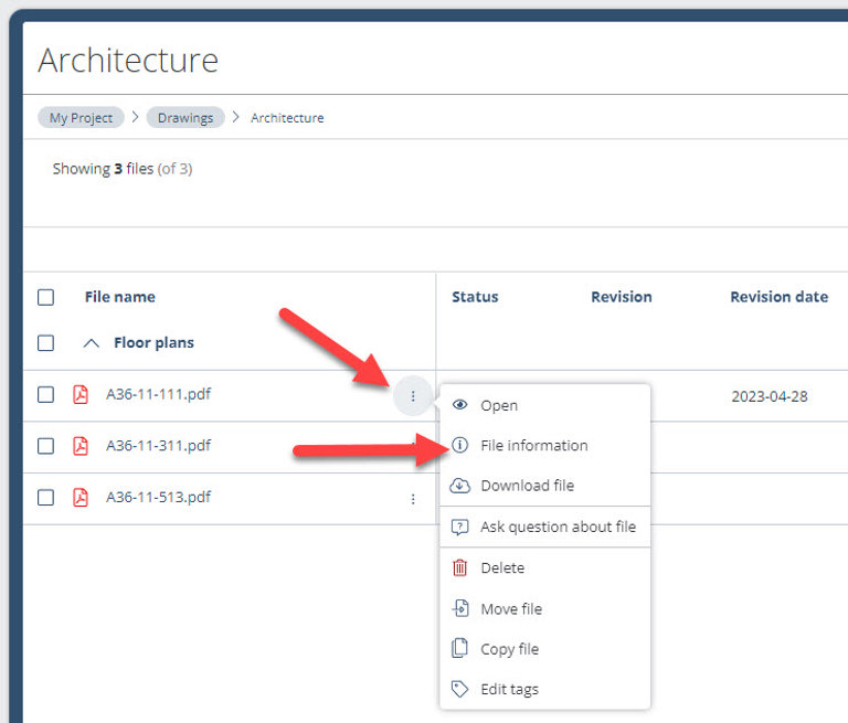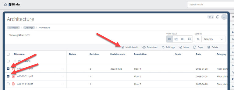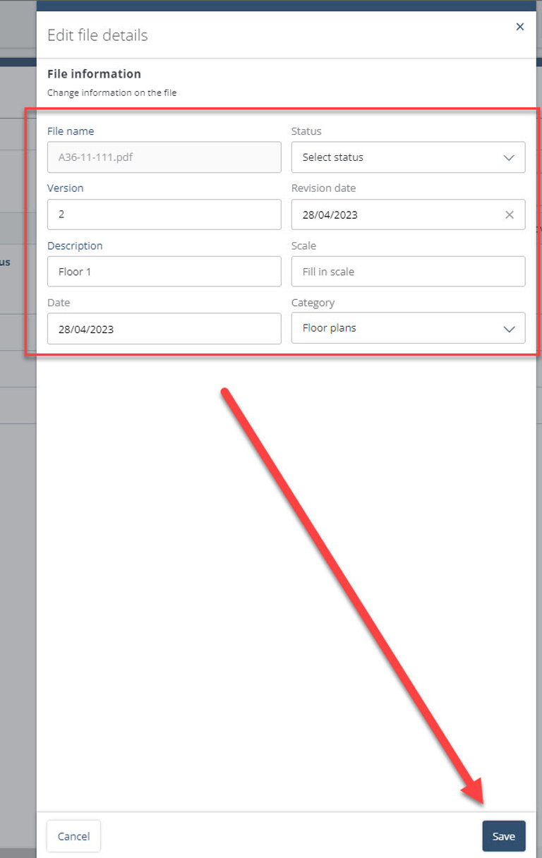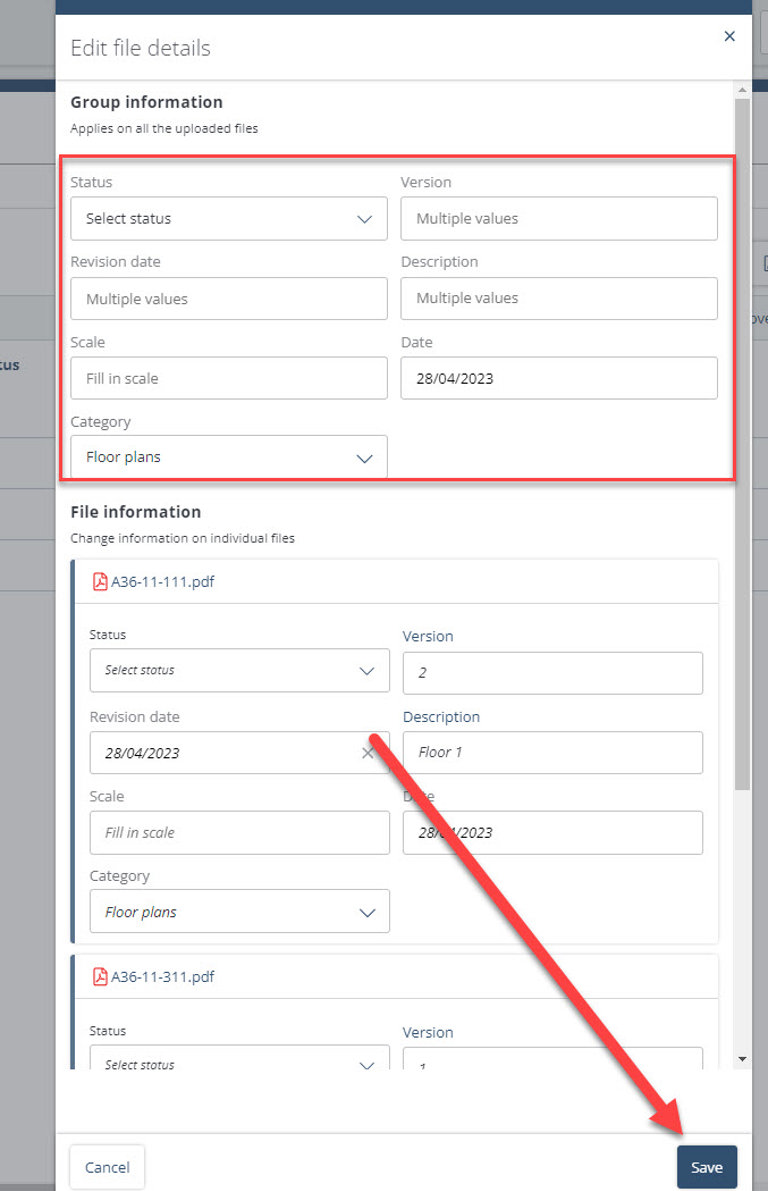 If the same information is to be changed in all the files, change/add under group information. An example is if all files require the "Construction document" status; change this to "Construction document" under group information. It is also possible to scroll down and change each file individually. When the editing is compete, click "Save".