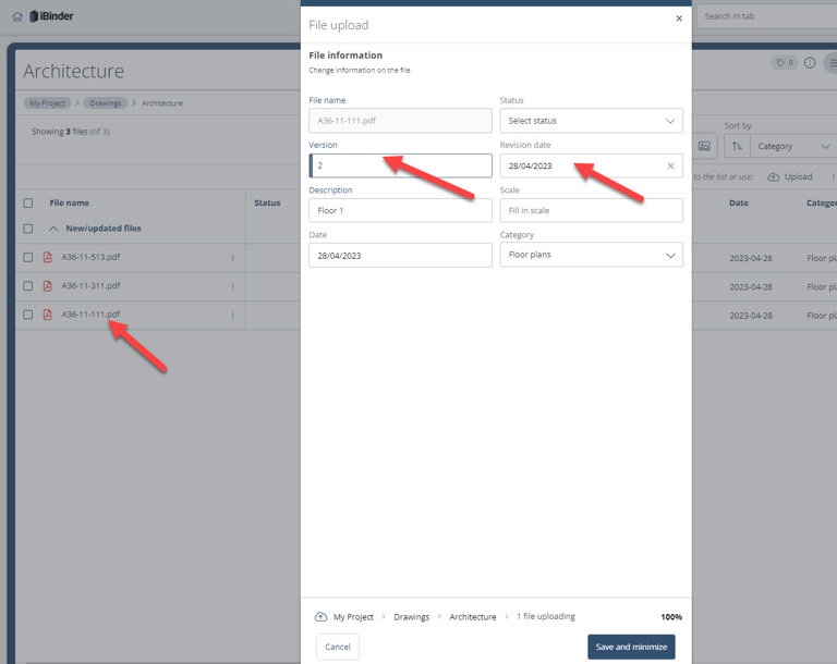iBinder makes it easy to find the latest version of a file, thanks to the built-in version management. When uploading a file that is already saved, the version and revision date fields in the information/metadata card shows that this is a new version. Version management "recognises" this by the name and type of file. Therefore, a file name should not be changed locally before uploading it.