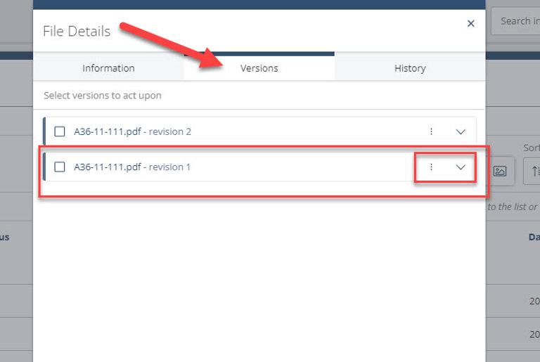 Click "Versions" to see previous versions of a file. To manage the version/file, click on the three dots or the arrow on the right.