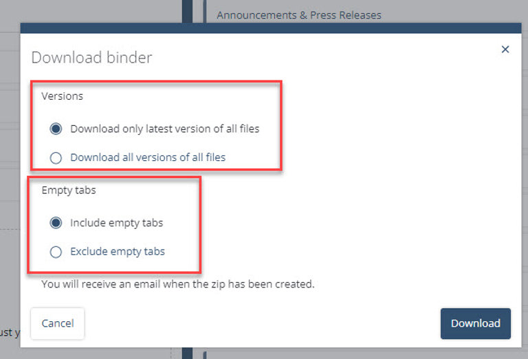 Then select whether to include all versions or only the latest version of each document. Also select whether to include empty tabs. Then click 'Download'. The system will now generate a ZIP file and a link will be created to download the content; the link will be sent to the e-mail you are logged in with.