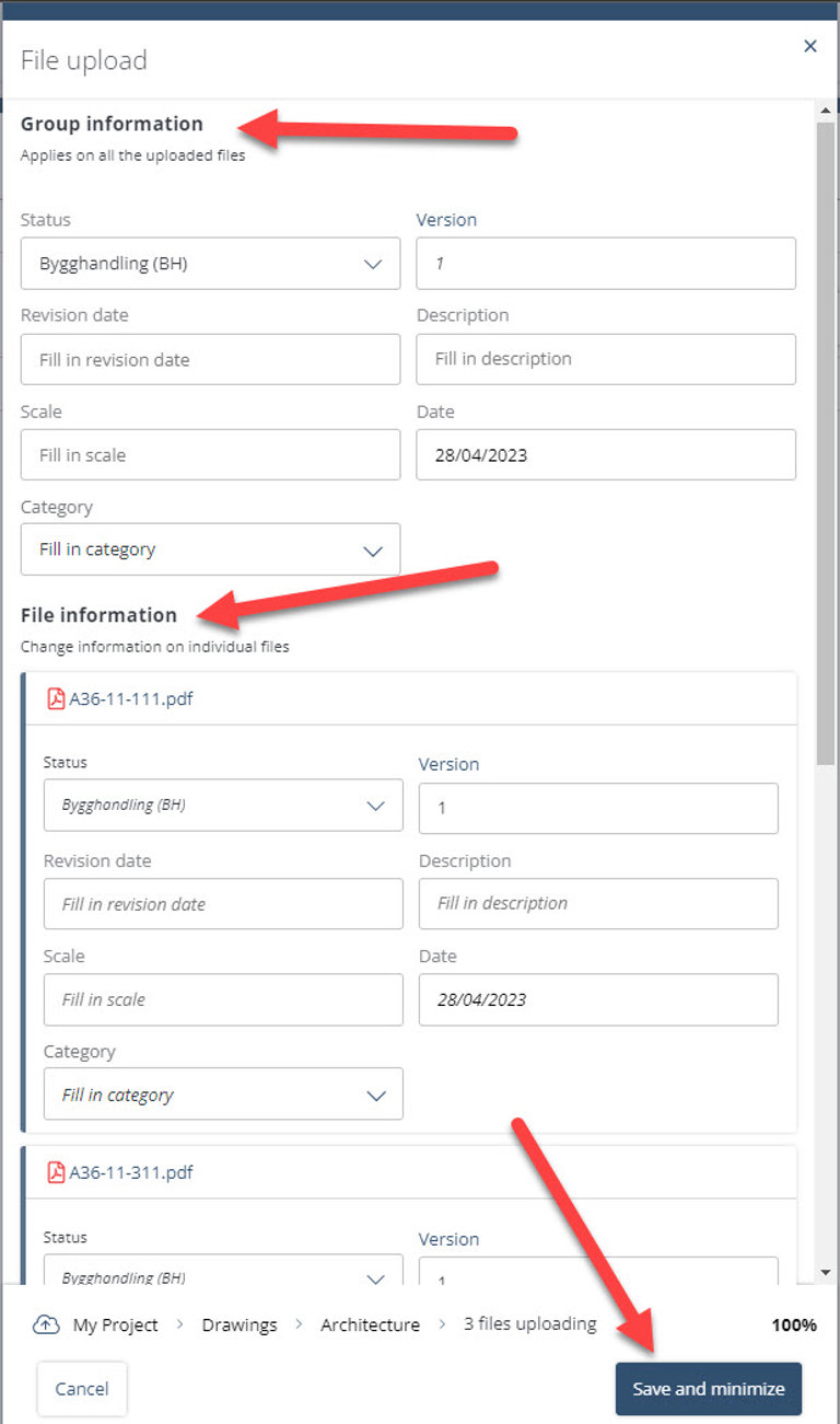 Now you can enter information/metadata for the files you want to upload. If you select more than one file, you can fill in group information; this means that all documents will receive this information. For example, if "Construction document" status is selected as group information, all files uploaded at that time will be given this status.