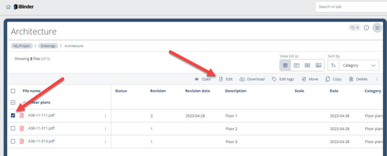 Tick the box to the left of the file and then click "Edit" to change information/metadata for a single file.