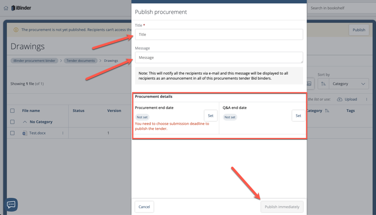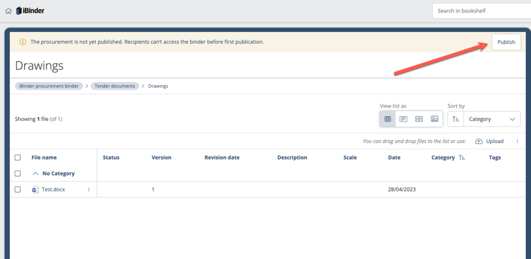 As soon as the first file is uploaded to the "Procurement documents" tab, a banner appears at the top with a message indicating that it has not been published. Click "Publish" to start publishing the procurement documents to make them visible to tenderers.