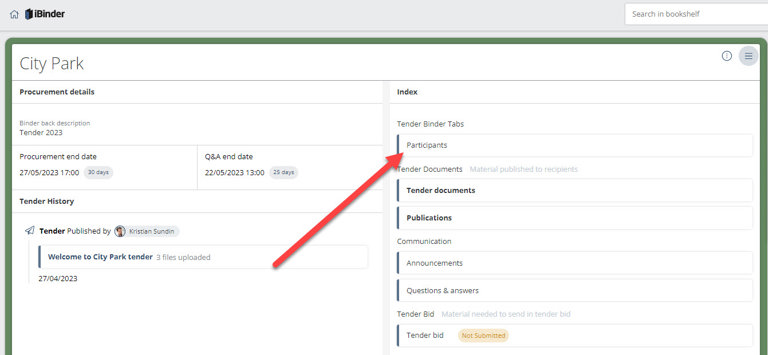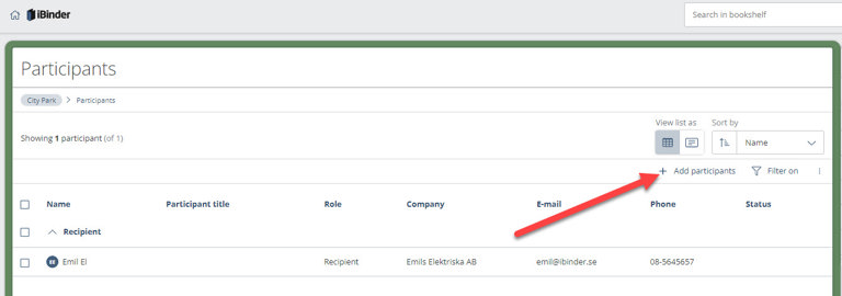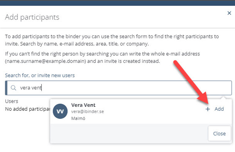 It is possible to search for participants among existing users in iBinder. Search for example by name, city or company. If the system finds a participant, click "+ Add".