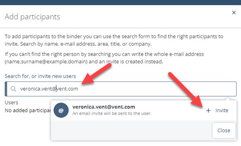 Alternatively, you can enter the participant’s e-mail address. If the person does not have an iBinder account, click "+ Invite" and the person will receive an invitation to the system and the option of setting up an account.