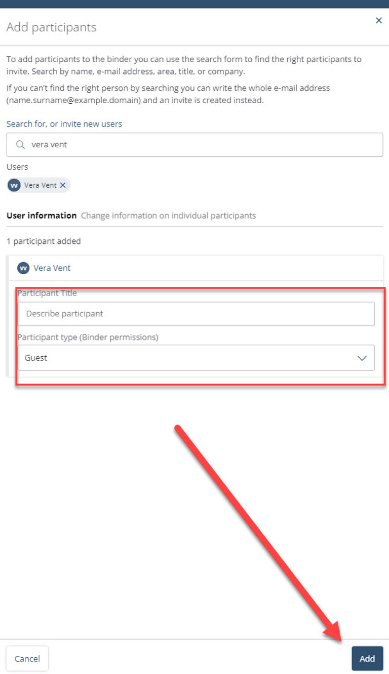 Enter the participant's title (optional) and select the required permission setting. Then click 'Add'.