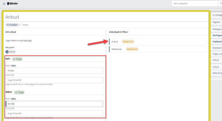 I noen tilfeller kan anskaffelsesansvarlig ha forberedt forskjellige prisfelt; Fyll i disse eventuelt med forbehold (rød markering nedenfor).