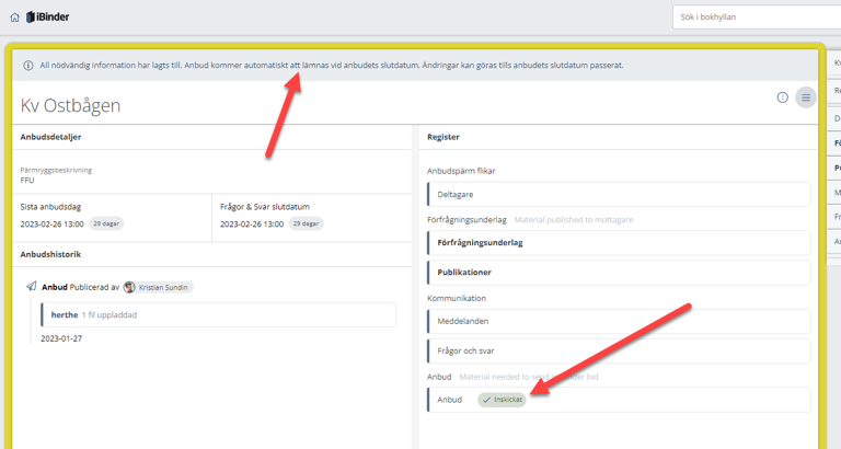 Anbudet blir automatiskt publisert til oppdragsgiveren og blir synlig for dem etter siste anbudsfrist. Eventuelle tildelingsbeslutninger vil bli kunngjort av oppdragsgiveren.