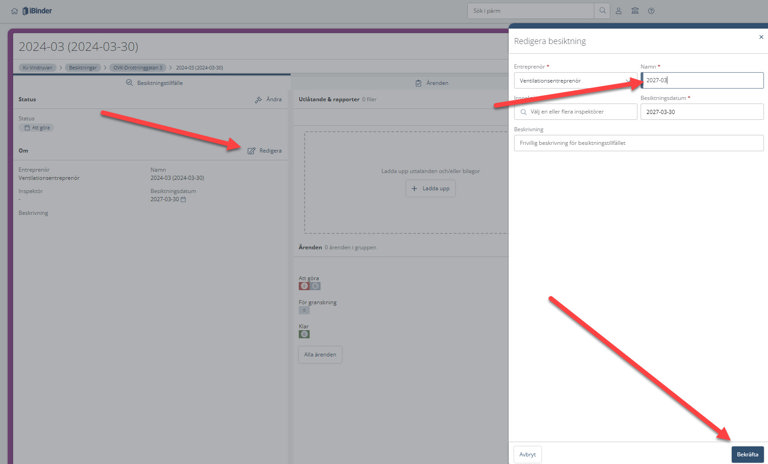 Deretter klikker du på "Rediger" og endrer "Navn" til for eksempel den nye datoen for neste inspeksjonspunkt. Deretter klikker du på "Bekreft".: