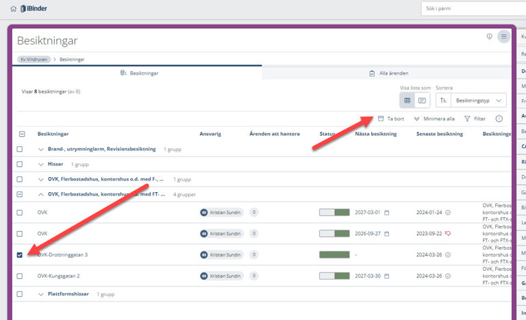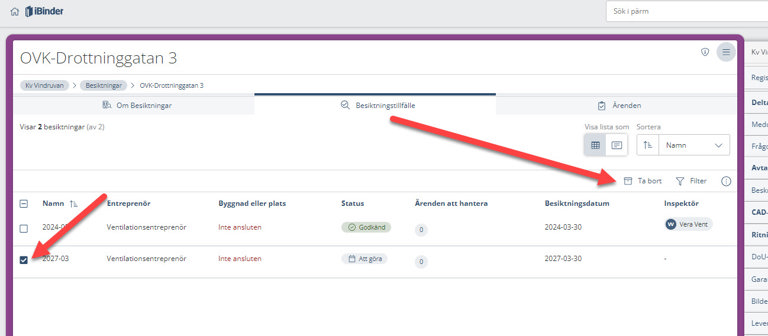 Klikk i boksen ved siden av inspeksjonen du vil fjerne, og klikk deretter på "Fjern":