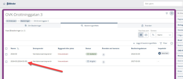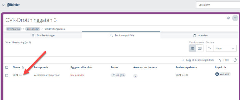 Hvis fanen "Besiktninger" mangler i mappen deres, må den først opprettes. Opprett en ny fane etter instruksjonene her og velg fanetype "Besiktninger".