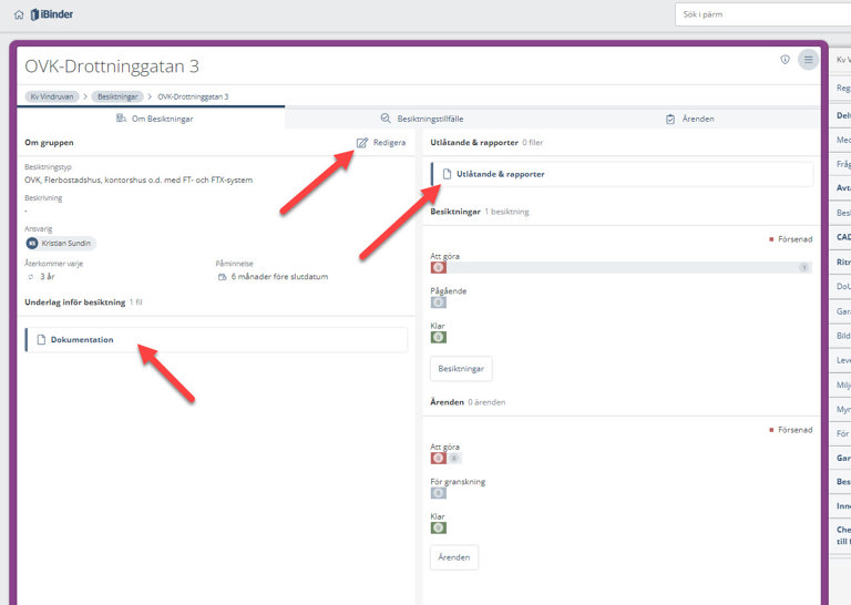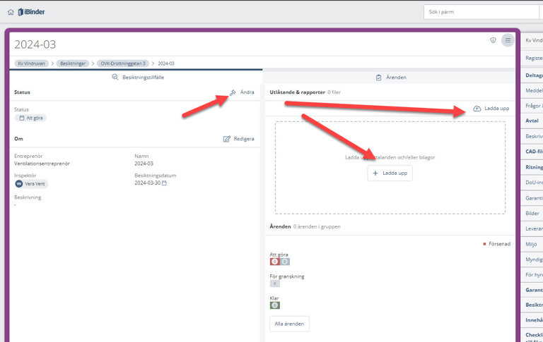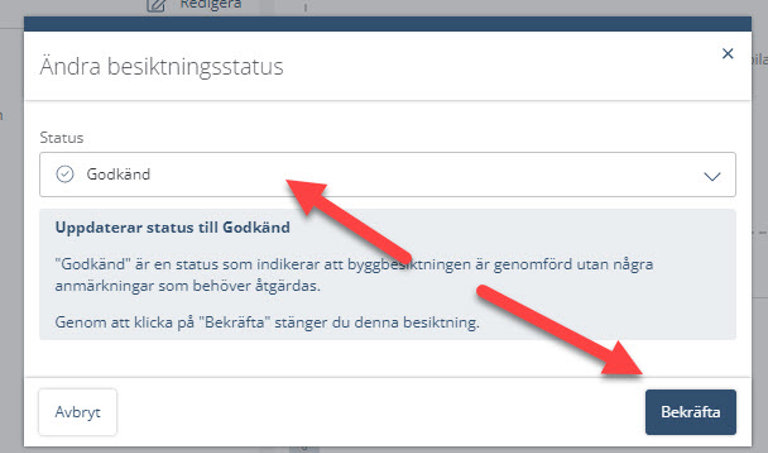Klikk på "Endre" for å oppdatere statusen på besiktningstilfellet: