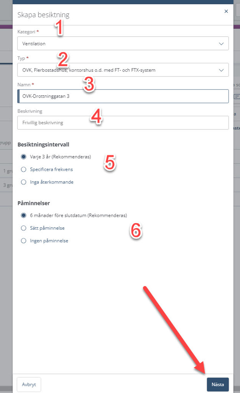 - 5) Besiktelse - velg hvor ofte besiktigelsen skal utføres.
