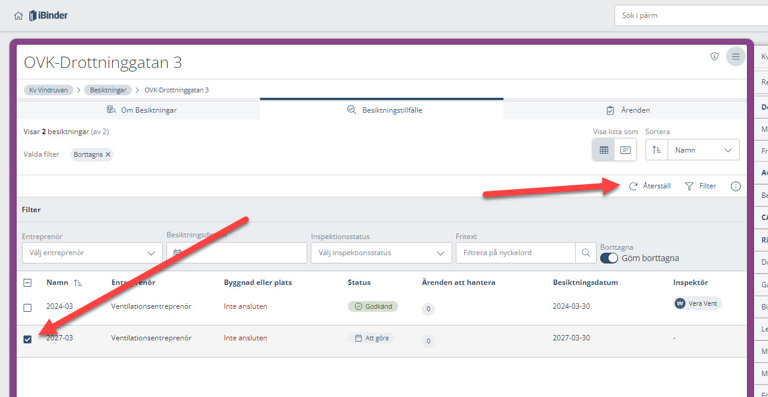 Klikk på det inspeksjonstilfellet som skal gjenopprettes, og deretter klikk på "Gjenopprett":
