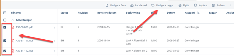 Man kan välja dokument, genom att bocka i dem och sedan klicka på "Redigera taggar".