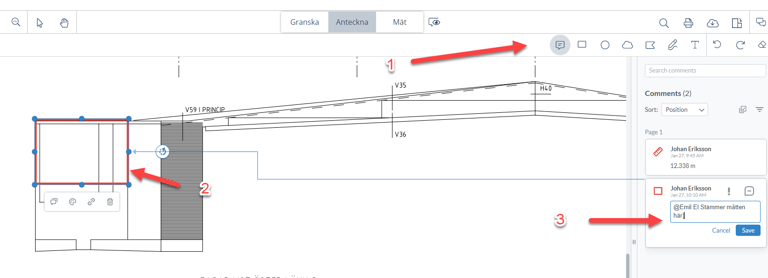 Om man vill göra en kommentar och uppmärksamma någon annan projektdeltagare på detta, klicka på kommentarsikonen uppe till höger och klicka därefter på markeringen. Ute till höger kan man sedan skriva kommentarer. För att uppmärksamma en annan deltagare, skriv @namn och välj sedan vem som ska uppmärksammas. De personerna kommer då att få en mailnotifiering om detta.