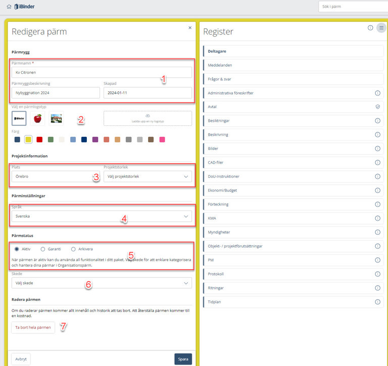 1) Här kan man ändra namn, beskrivning och datum på pärmen.