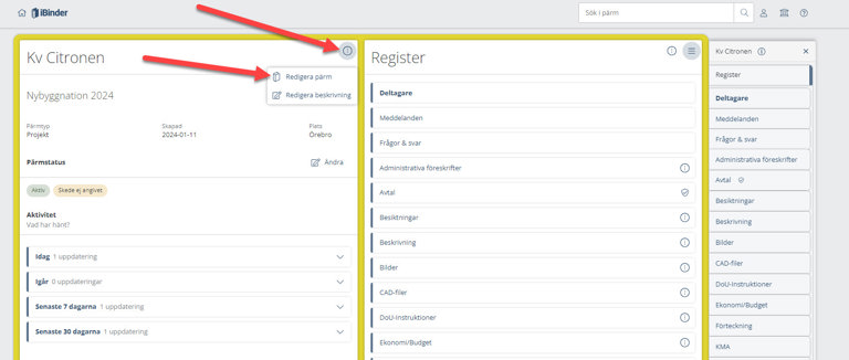 För att redigera pärminformationen så klickar man på cirkeln enligt nedan och sedan på "Redigera pärm":