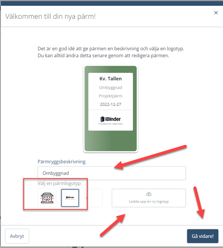Om pärmen ska ha er logotyp, kan ni välja en befintlig för er organisation eller att ladda upp en ny.