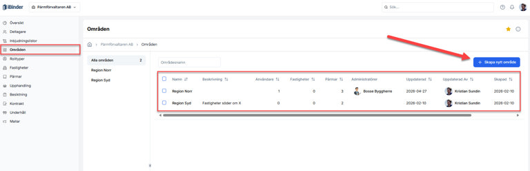 Klicka på knappen + Skapa nytt område för att skapa ett nytt område.