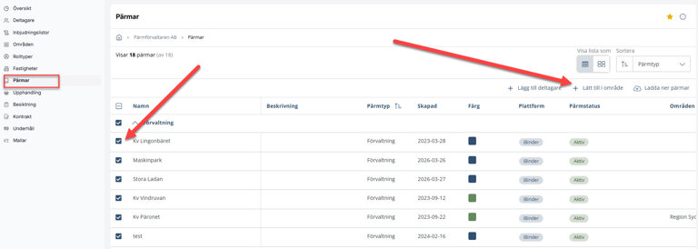 Tips: vill man koppla flera pärmar i taget till ett område görs detta enklast i fliken Pärmar enligt bild: