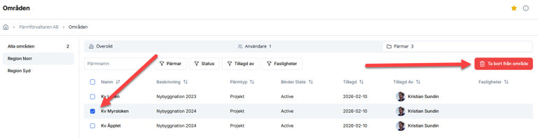 Vill man ta bort en pärm från ett område, bocka i rutan och klicka på Ta bort från område.