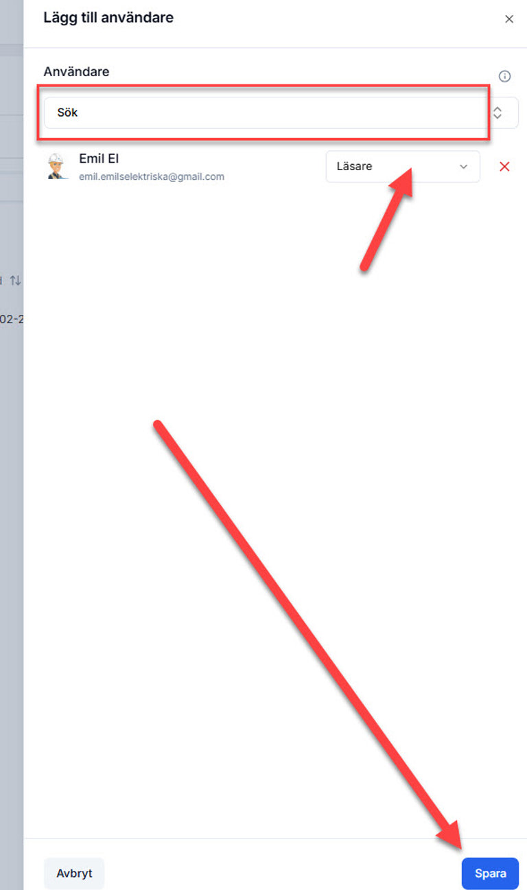 Sök i listan på organisationens användare och välj de som ska läggas till. Välj sedan roll och klicka på Spara.