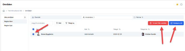 Vill man redigera en användares roll i efterhand, eller ta bort en användare från ett område; bocka i användaren och klicka på Redigera roll eller Ta bort från område.