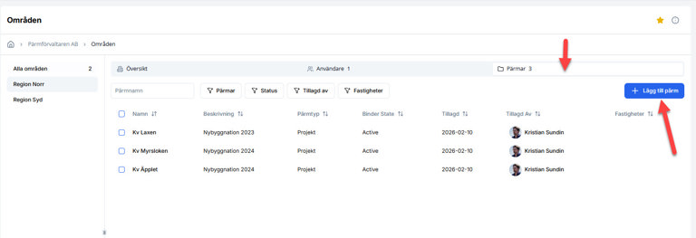 Klicka på underfliken Pärmar för att se vilka pärmar som är kopplade till det aktuella området. Det går att söka, filtrera och sortera enligt önskemål.