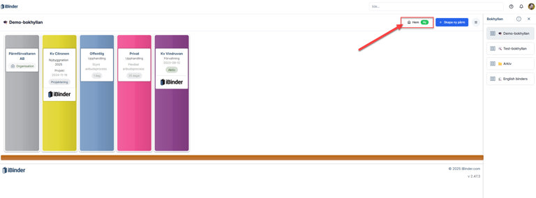 Om man har vyn för bokhyllan så kan man växla till nya hem-vyn genom att klicka på "Hem":