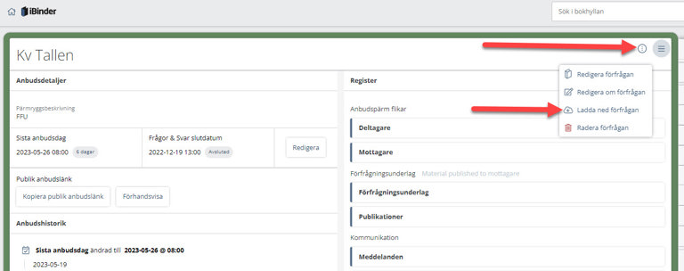 Under fliken "Förfrågningsunderlag" hittar man alla handlingar och dokument. Alternativt kan man välja att spara hem hela förfrågningsunderlaget till sin dator, klicka i så fall på "prickarna" och välj "Ladda ned förfrågan".