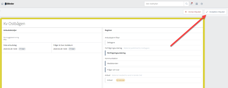 Vill man fortsätta och vara med och lämna in anbud så klicka på "Acceptera inbjudan":